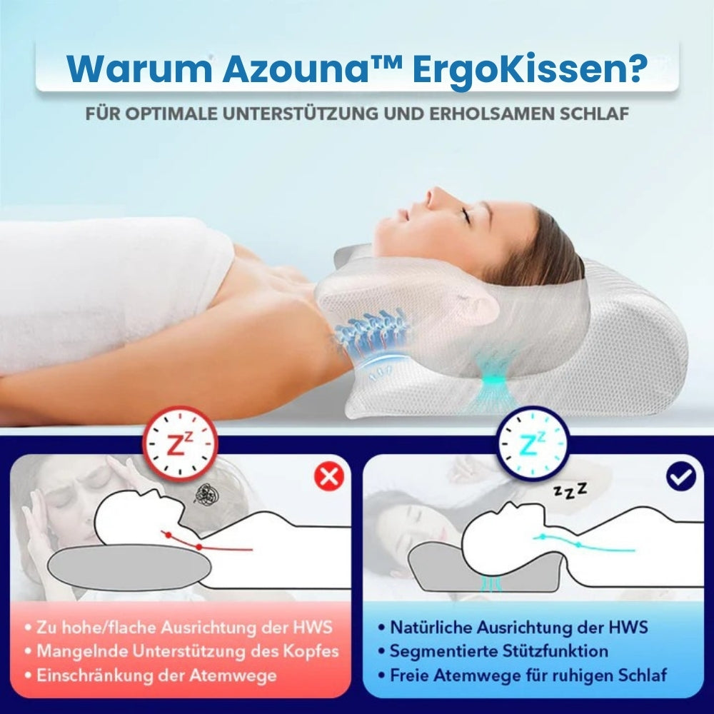 Das Azouna™ Ergo-Kissen unterstützt deine Halswirbelsäule in ihrer natürlichen Position und reduziert so den Druck auf Nacken und Schultern. Dadurch werden Verspannungen, Gelenkbelastungen und Nervenkompressionen effektiv vorgebeugt, die häufig zu Schmerzen führen.