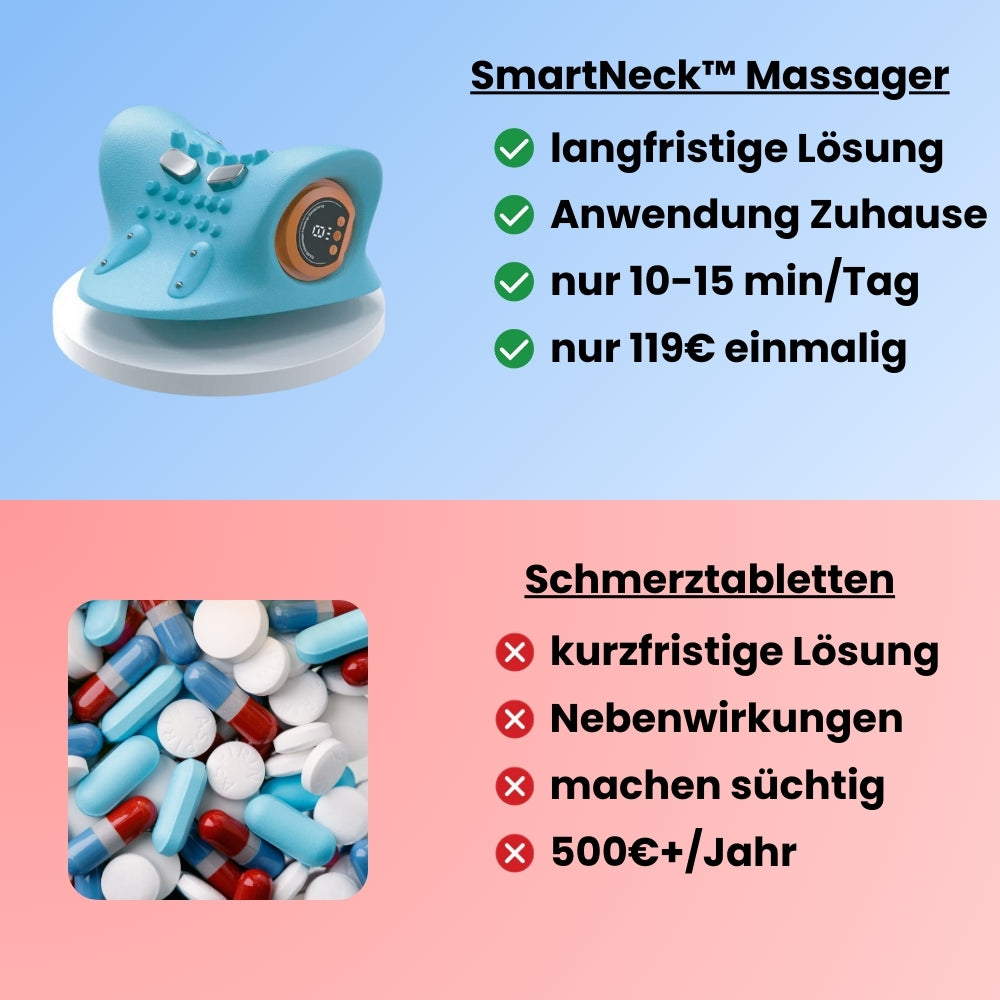 Schon 10 Minuten tägliches Liegen auf dem SmartNeck reichen aus, um Ihre Wirbelsäule sanft in ihre natürliche Position zu bringen und die umliegenden Wirbel zu entlasten. Mit jeder Sekunde lösen sich die eingeklemmten Nerven, was allmälig zu einer dauerhaften Linderung führt - ohne teure Therapien oder Medikamente. Genießen Sie ein Leben ohne Nackenprobleme & lästigen Kopfschmerzen.