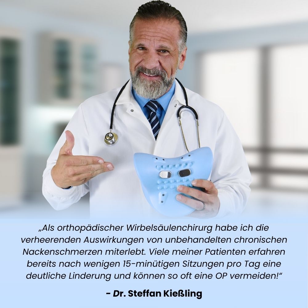 Stundenlanges Sitzen, jahrelange körperliche Belastung und eine schlechte Haltung üben enormen Druck auf unsere Halswirbelsäule aus. Im Laufe der Zeit verliert der Nacken so seine natürliche Krümmung, wodurch Bandscheiben verschoben werden und auf die umliegenden Nerven drücken - welches zu quälenden Schmerzen in Nacken, Schultern und Armen führt, wie auch chronischen Spannungskopfschmerzen, die das tägliche Leben stark beeinträchtigen können.